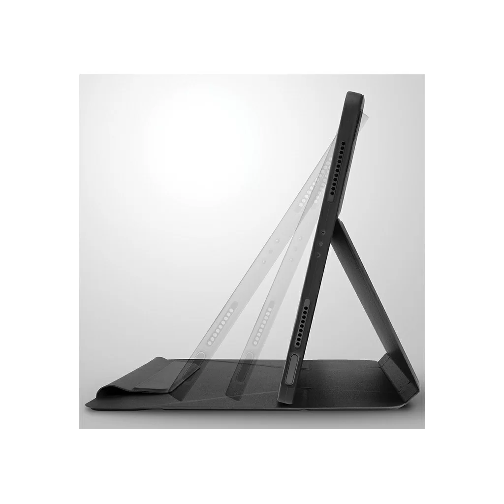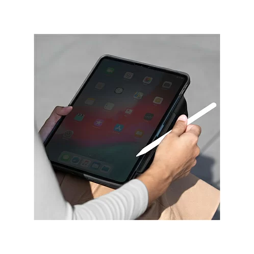 Тонкий защитный чехол Ryze 360 изготовлен из приятной на ощупь искусственной кожи. Продуманная складная конструкция дает возможность просмотра iPad на трёх различных вариантах высоты. Специальный магнитный диск позволяет вращать планшет на 360 градусов для выбора оптимального положения. Противоскользящая внутренняя подкладка помогает фиксировать устройство под разными углами. Благодаря встроенному держателю для хранения и зарядки Apple Pencil стилус всегда будет под надежной защитой и не потеряется. Встроенные в обложку магниты предотвратят случайные открытия и обеспечат включение/выключение планшета при открывании чехла (активация sleep-функции). Заглушки, интегрированные в чехол, защищают клавиши устройства от попадания грязи, пыли и воды.