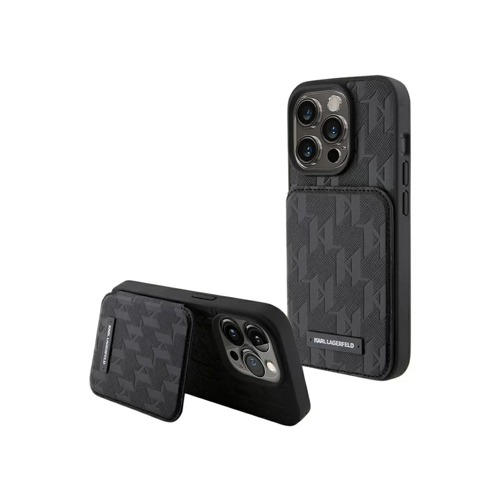 Чехол Lagerfeld для iPhone 15 Pro Max Cardslot Stand PU Saffiano Monogram Plate logo Hard Black