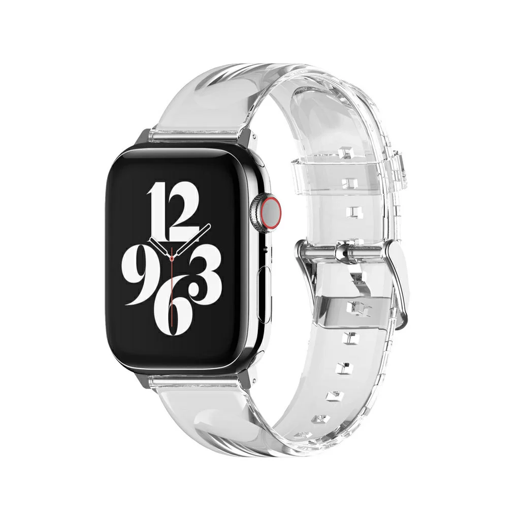 Элегантный прозрачный ремешок для Apple Watch из мягкого термополиуретана высокого качества. Легко застегивается и регулируется по запястью. Воздухопроницаемая гипоаллергенная поверхность обеспечивает большую устойчивость к поту. Надежное крепление и эргономичный дизайн делают ношение ремешка чрезвычайно удобным для повседневного использования. Со временем не теряет цвет и форму, легко моется. Совместим с часами Apple Watch с корпусом 38/40/41 мм