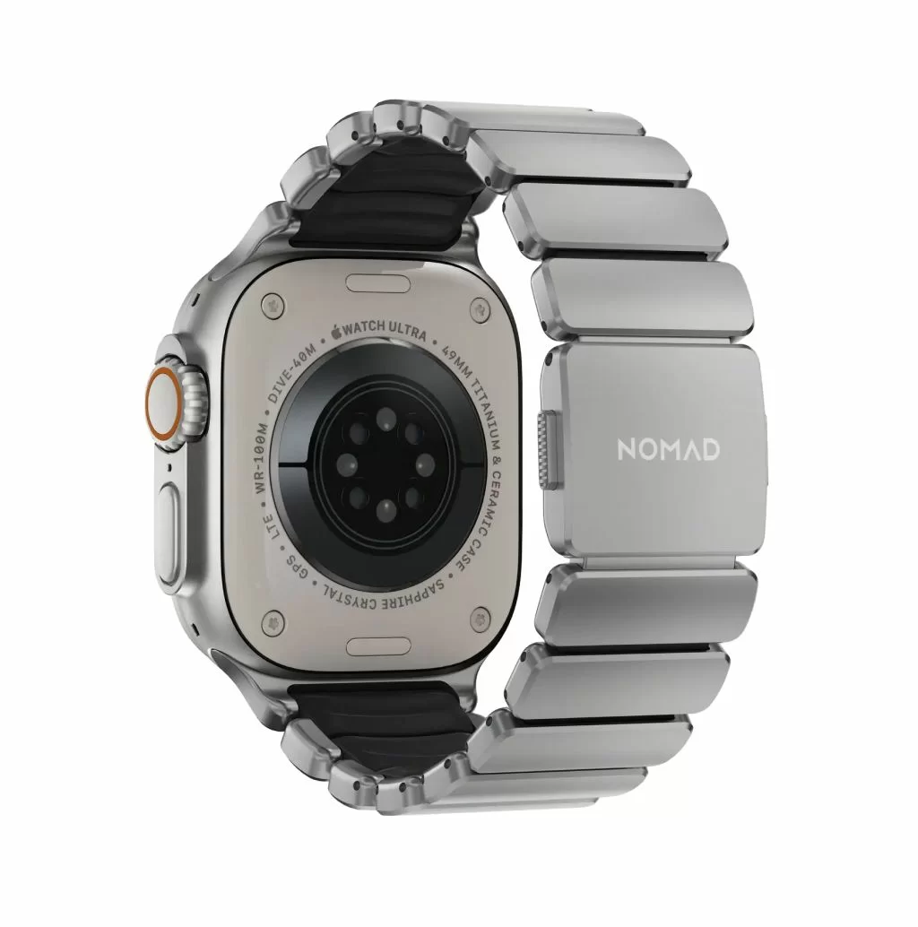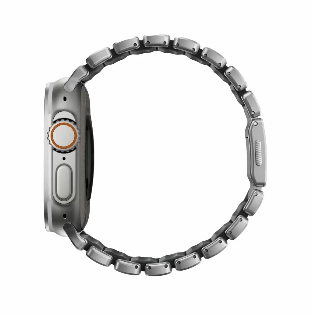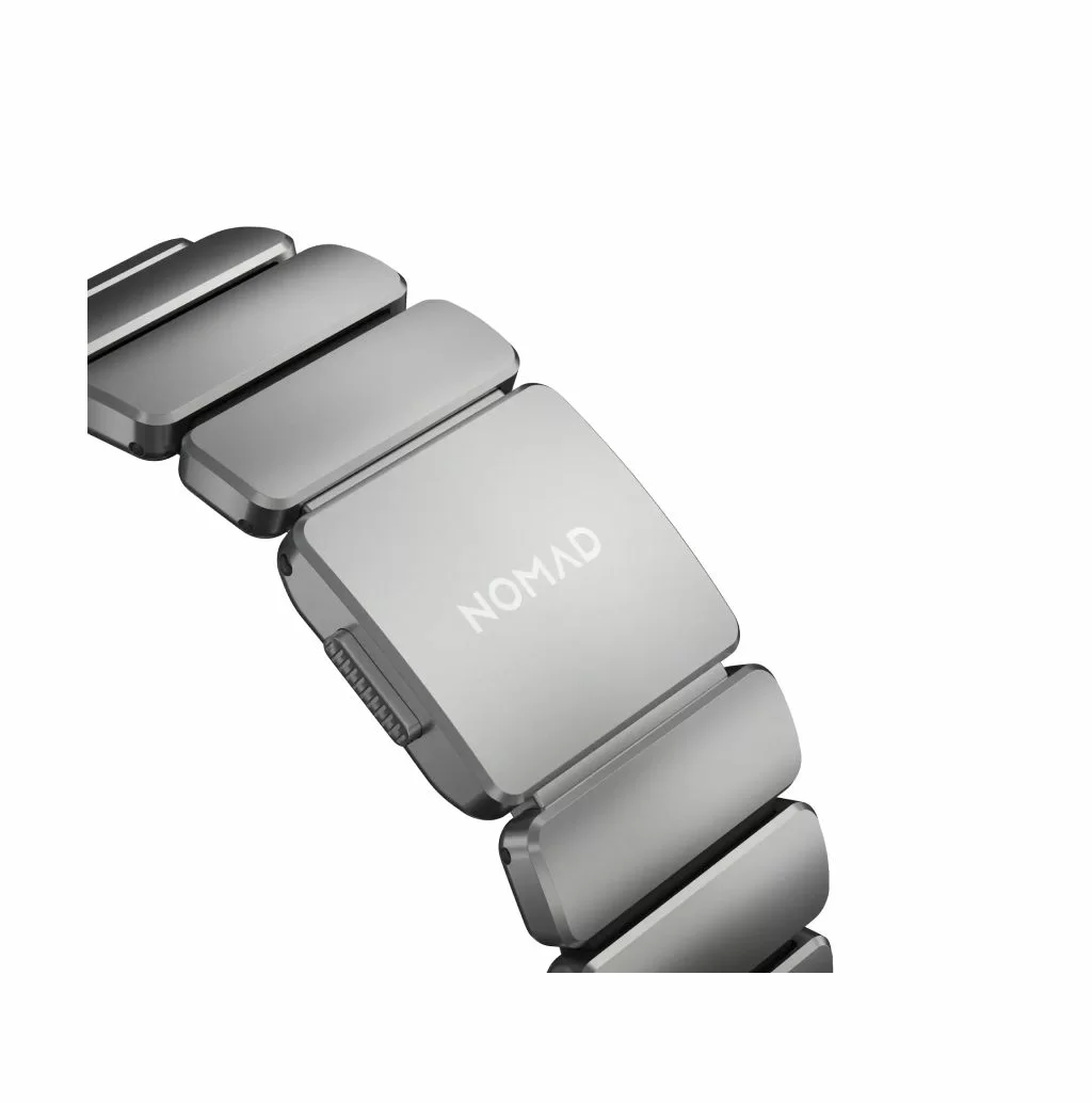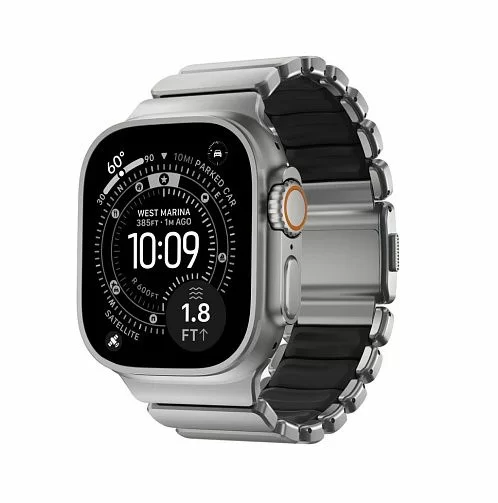 Ремешок Nomad Stratos объединяет несочетаемое: внешний каркас звеньев отлит из титана Grade 4, а внутренняя часть выполнена из мягкого фторэластомера (FKM). Титан Grade 4 значительно прочнее стандартных сплавов, используемых в аксессуарах, а специальное DLC-покрытие защищает поверхность металла от царапин и потертостей, сохраняя премиальный вид даже при жесткой эксплуатации.