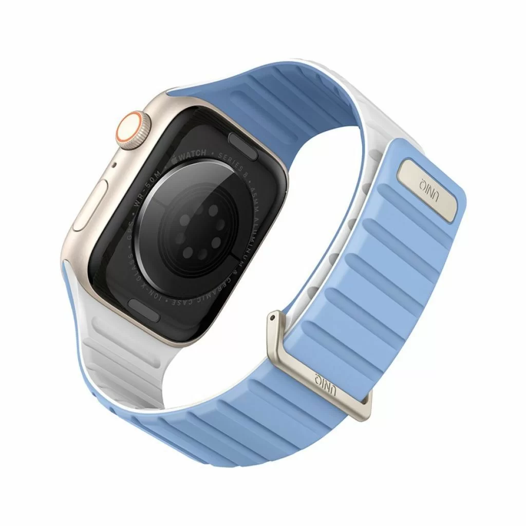 Двусторонний ремешок из мягкого силикона Uniq REVIX EVO для Apple Watch с размером корпуса 42/41/40. Вы можете легко поменять внешние стороны ремешка в зависимости от своего стиля и предпочтений. Фиксируется на руке с помощью удобной магнитной застежки, выдерживает нагрузку до 1.2 кг. Возможность регулировки длины за счет встроенных магнитов обеспечивает точное соответствие размерам руки. Металлическая стальная застежка дополнительно фиксирует устройство на запястье, позволяя не беспокоиться об утере даже при занятиях спортом.