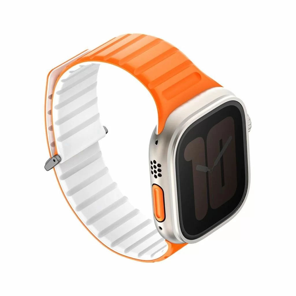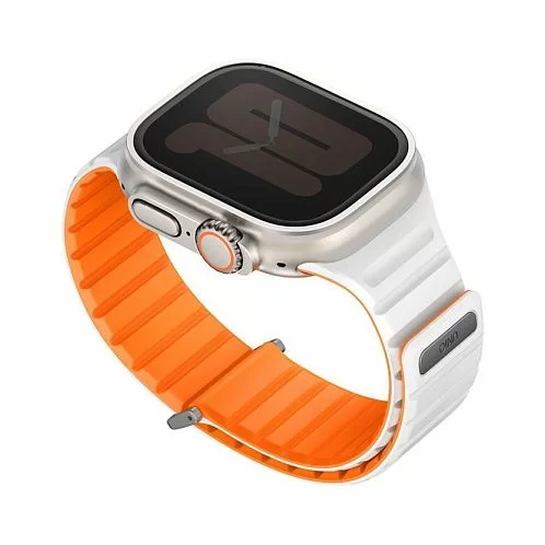 Двусторонний ремешок из мягкого силикона Uniq REVIX EVO для Apple Watch с размером корпуса 49-46-45-44. Вы можете легко поменять внешние стороны ремешка в зависимости от своего стиля и предпочтений. Фиксируется на руке с помощью удобной магнитной застежки, выдерживает нагрузку до 1.2 кг. Возможность регулировки длины за счет встроенных магнитов обеспечивает точное соответствие размерам руки. Металлическая стальная застежка дополнительно фиксирует устройство на запястье, позволяя не беспокоиться об утере даже при занятиях спортом.