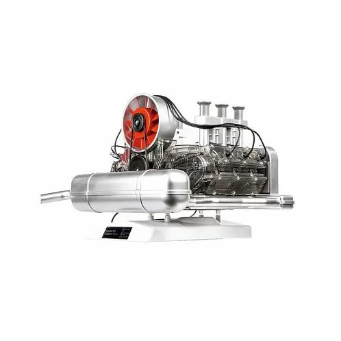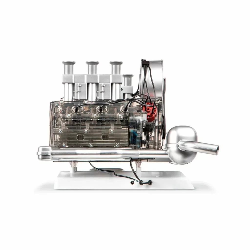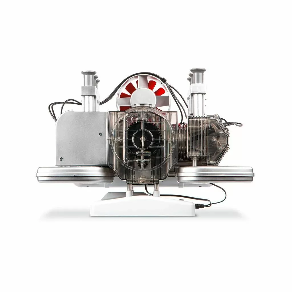 Пластиковые компоненты привинчиваются или вставляются вместе для сборки и гарантируют приятный опыт сборки модели — без склеивания. Коленчатый вал, поршни и клапаны движутся в истинном взаимодействии с оригиналом. Прозрачные детали корпуса позволяют видеть и понимать механику оппозитного двигателя снаружи.