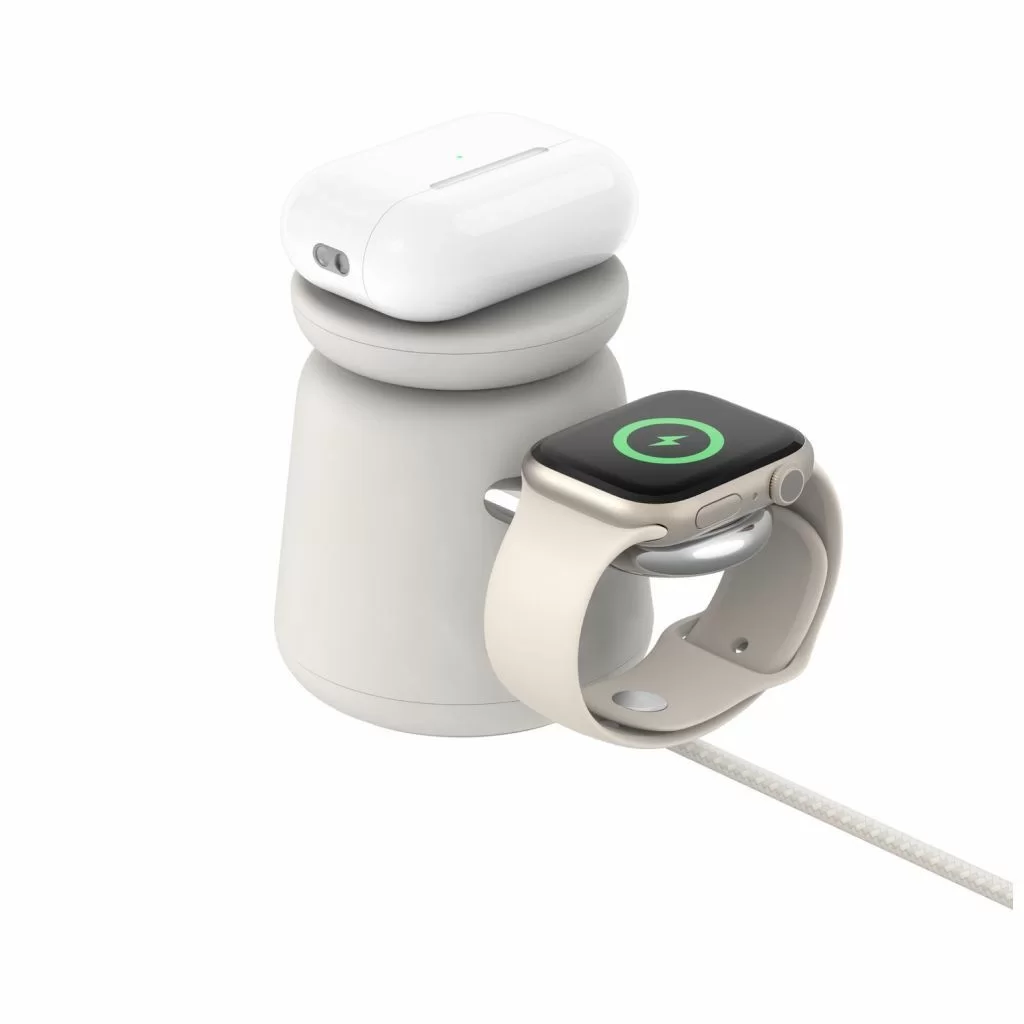 Особенность зарядной станции Belkin BoostCharge Pro — отсоединяющаяся зарядка для Apple Watch. Благодаря этому её можно снять и использовать в путешествиях. Она подключается по USB-C, поэтому зарядку для часов можно подключить к любому адаптеру или пауэрбанку с выходом Type-C, а это значит, что в поездке будет минус один запутывающиеся кабель.