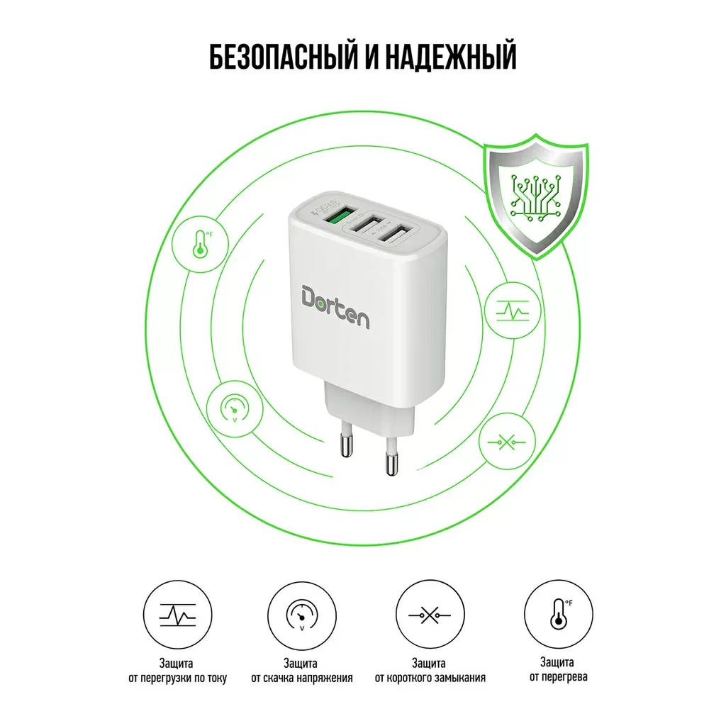 Dorten 30W QC+2 USB - это универсальный зарядник, который подойдет для любых устройств, включая планшеты, смартфоны и сотовые телефоны. С тремя разъемами USB вы можете заряжать три устройства одновременно, а один из трех разъемов поддерживает быструю зарядку до 80% за 25 минут благодаря технологии быстрой зарядки QC 3.0. Другие два порта USB обеспечивают быструю зарядку в общей сложности до 12Вт.