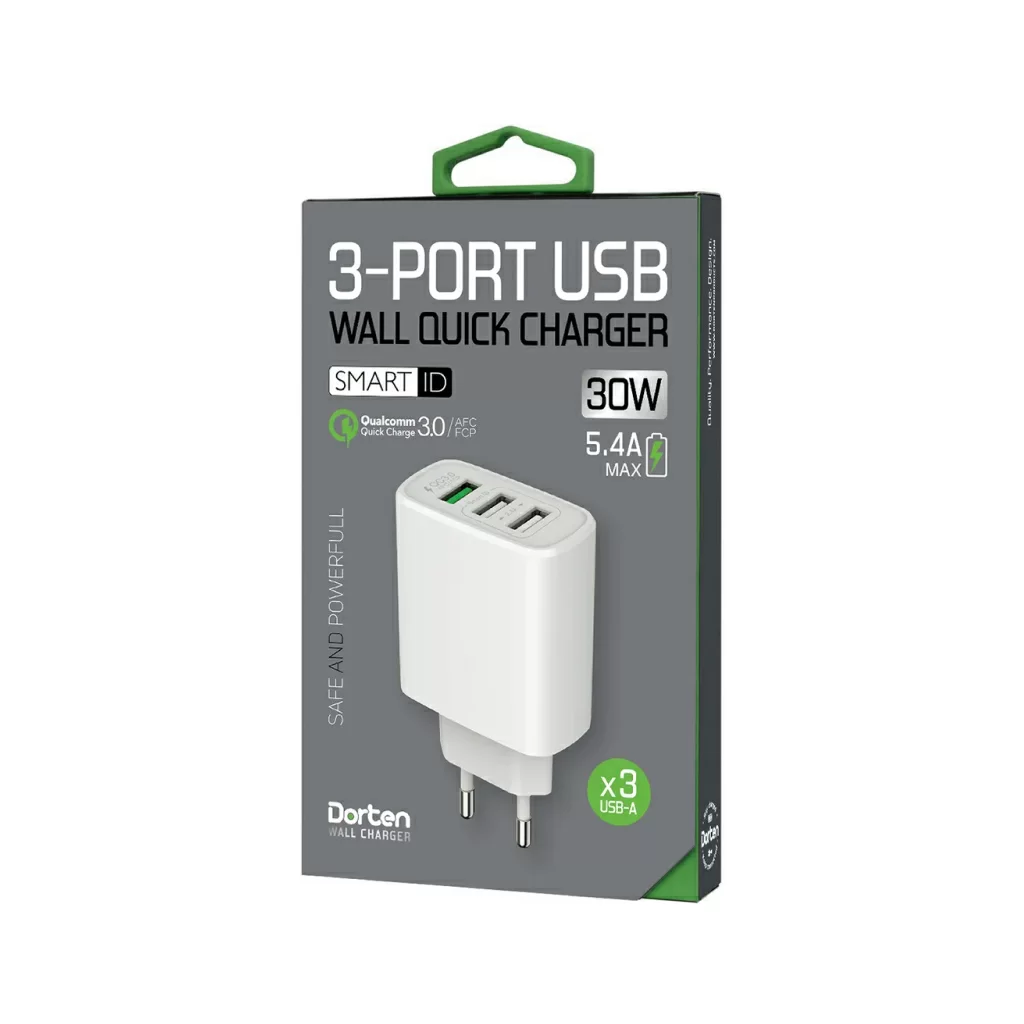 Dorten 3-Port USB Smart ID 30W Wall Quick Charger: QC3.0+2.4A