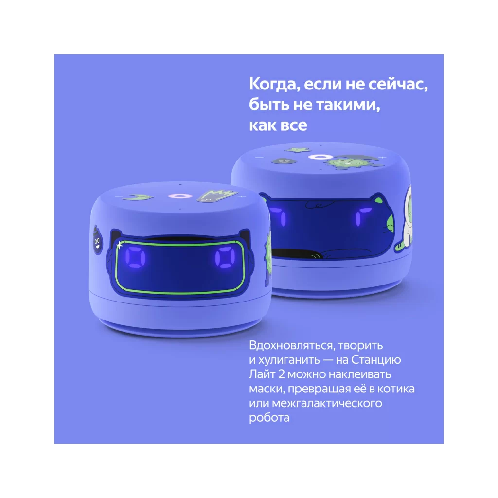 Со Станцией Лайт 2 дети могут играть, хулиганить и превращать умную колонку в необычных персонажей. Например, можно наклеить на колонку маску котика или межгалактического робота. А стикерами из набора здорово украшать и умную колонку, и всё вокруг.
