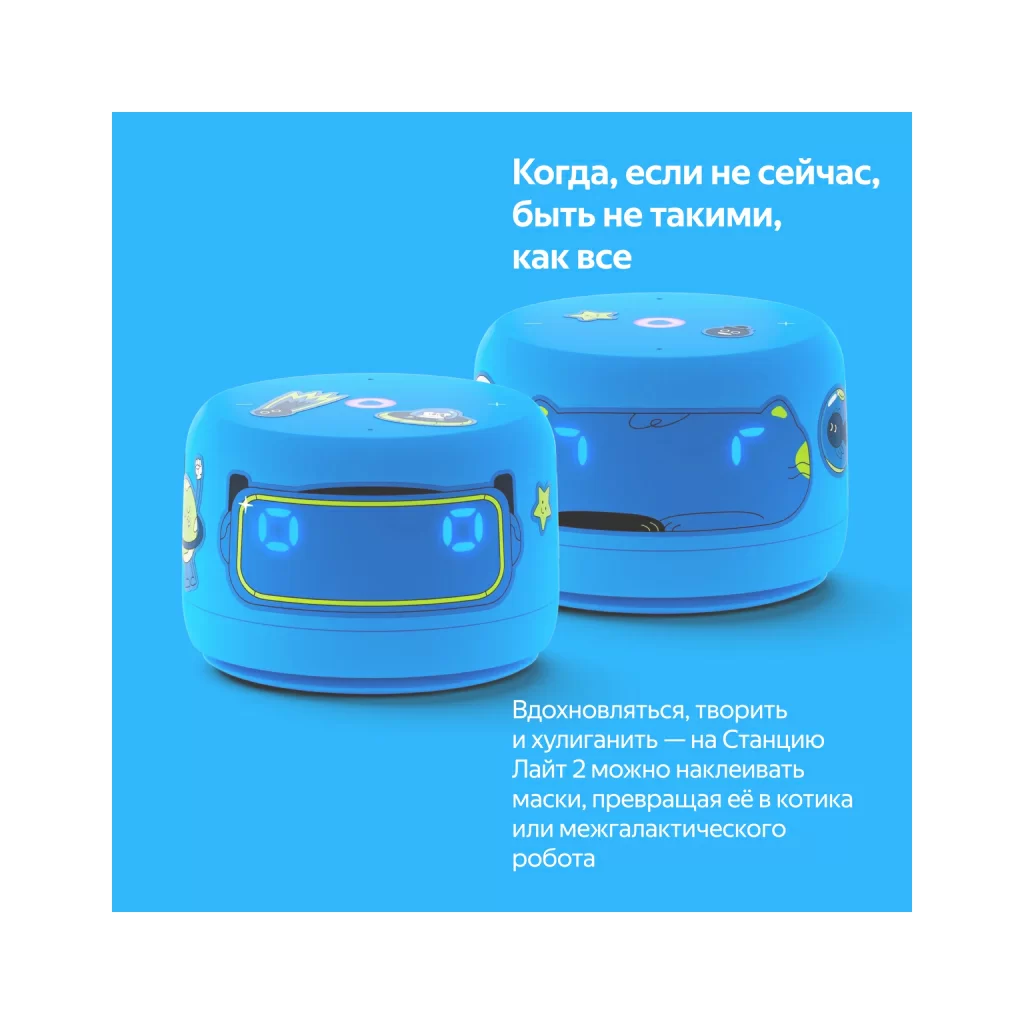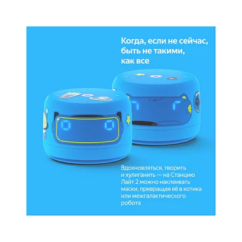 Со Станцией Лайт 2 дети могут играть, хулиганить и превращать умную колонку в необычных персонажей. Например, можно наклеить на колонку маску котика или межгалактического робота. А стикерами из набора здорово украшать и умную колонку, и всё вокруг.