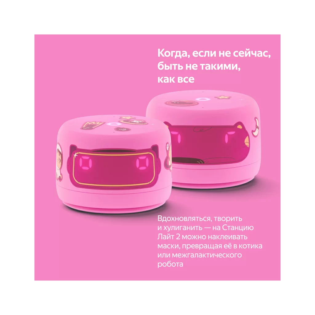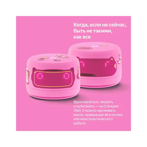 Со Станцией Лайт 2 дети могут играть, хулиганить и превращать умную колонку в необычных персонажей. Например, можно наклеить на колонку маску котика или межгалактического робота. А стикерами из набора здорово украшать и умную колонку, и всё вокруг.